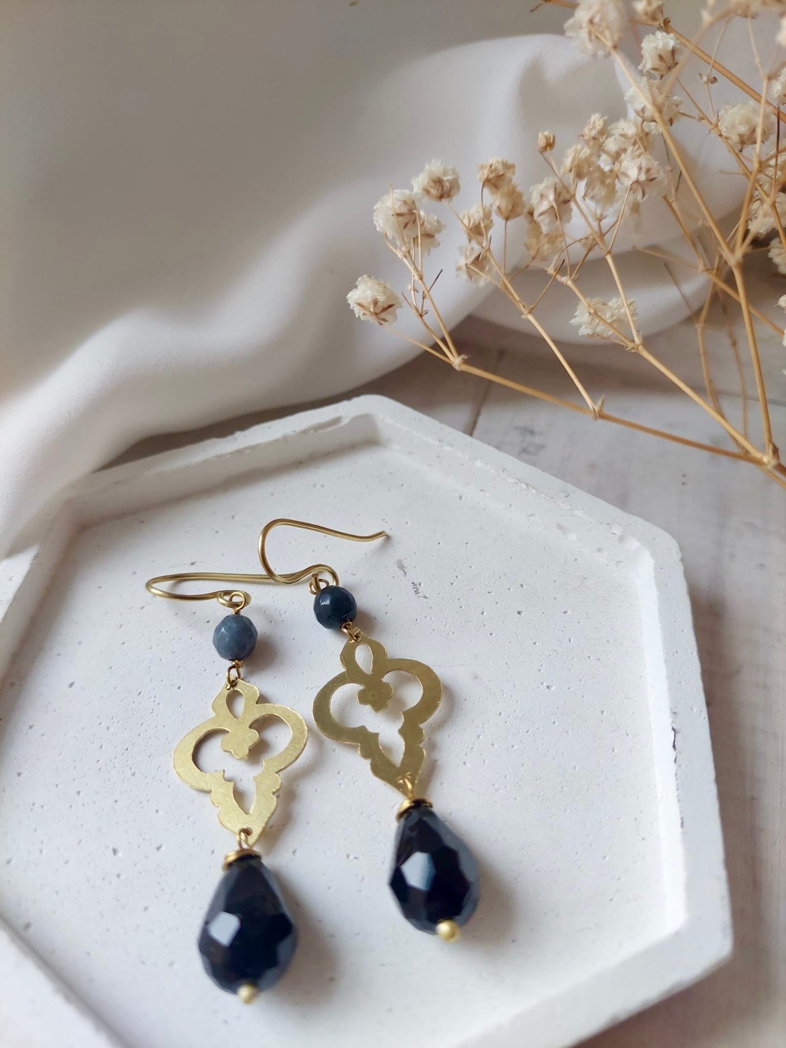 Dimensioni: struttura in ottone 2 cm con pietra tonda 6/8 mm pendente e goccia 1.8cm